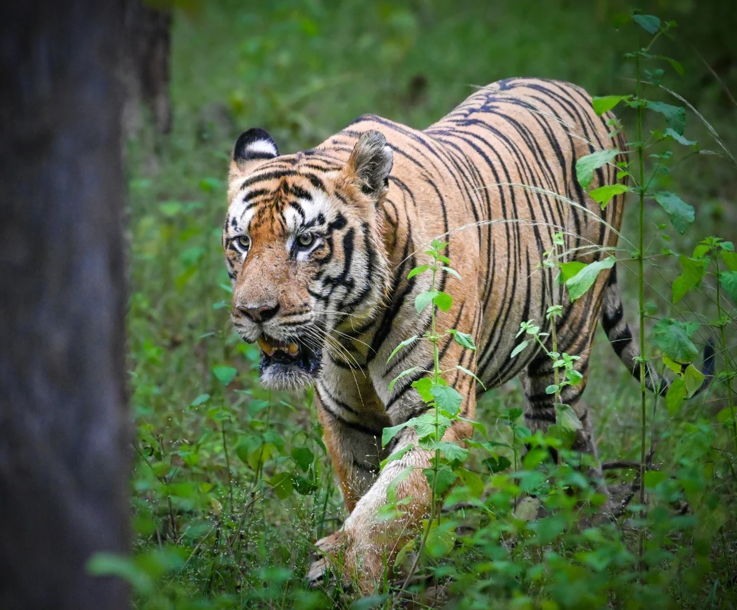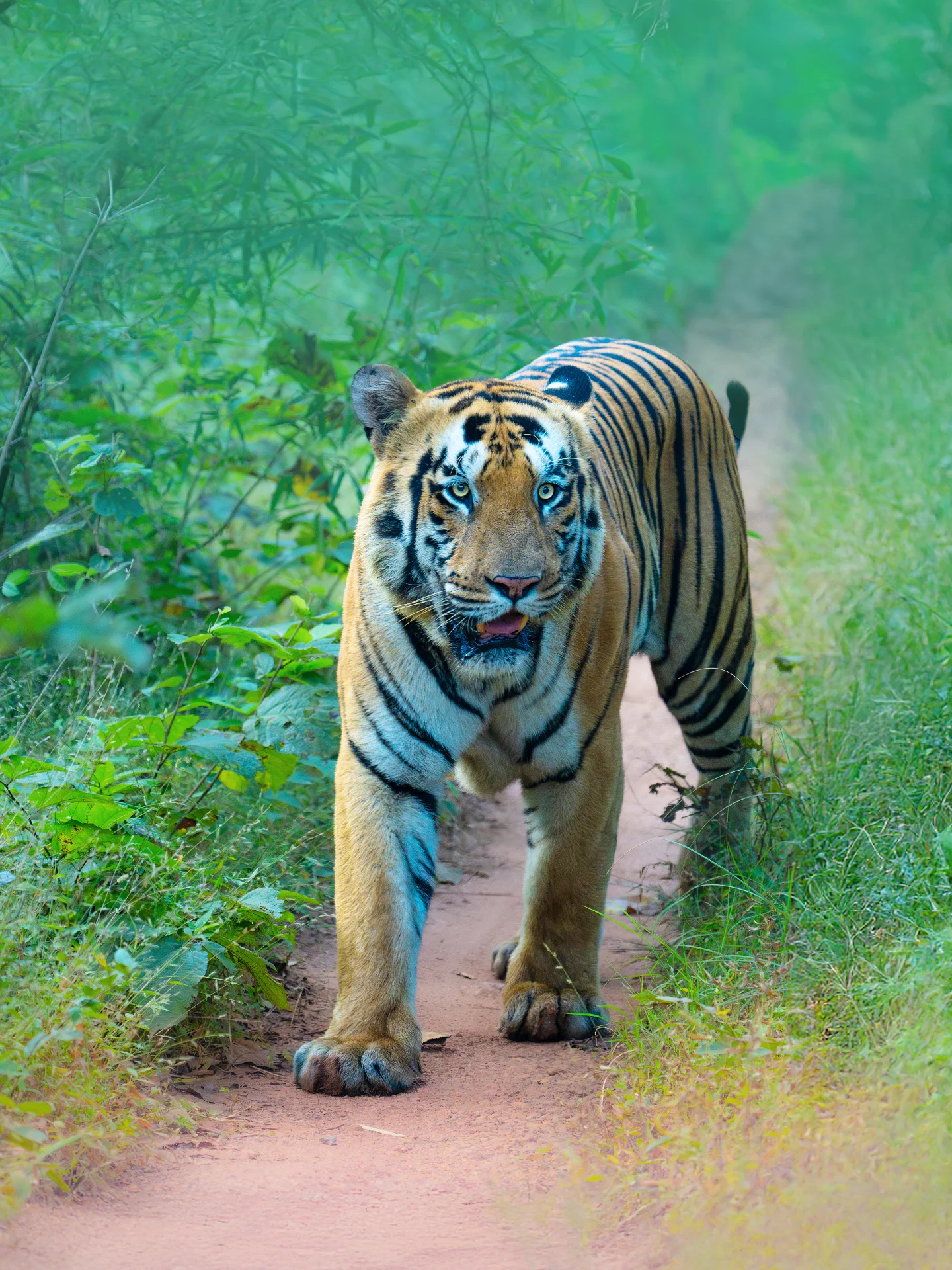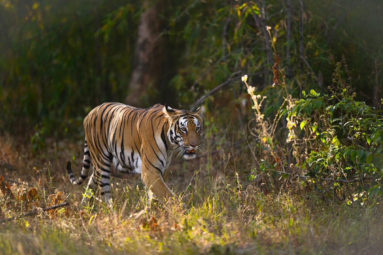 The forest canopy includes towering teak trees, dense bamboo thickets, flowering plants, medicinal herbs, and a variety of grasses. Key species include Teak (Tectona grandis), Bamboo (Dendrocalamus strictus), Ain, Mahua, Bija, Tendu, Palas, Semal, and Arjun. Shrubs and climbers such as Lantana, Gum Acacia, Pathari, and Grewia form the understory. Seasonal blooms like karanj flowers, white kachnar, and fiery red Palas blossoms paint the forest in vibrant colors, while monsoons transform Tadoba into a lush green paradise.