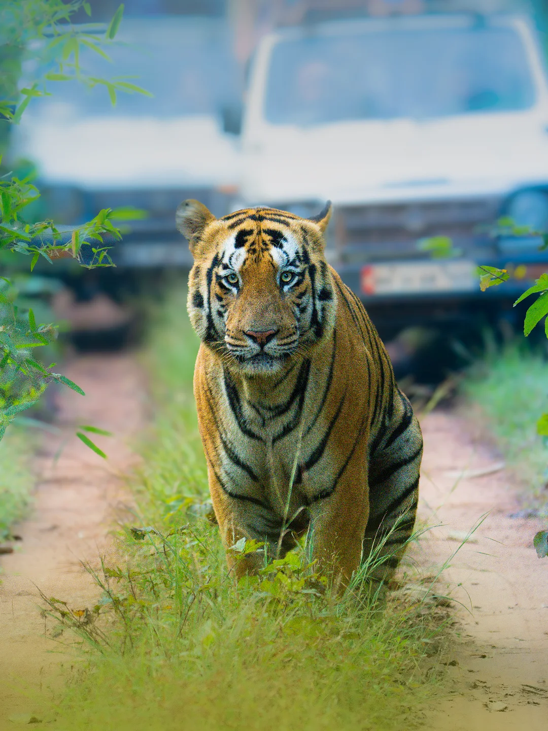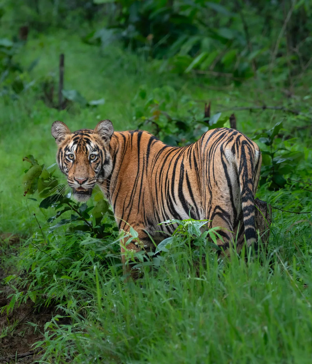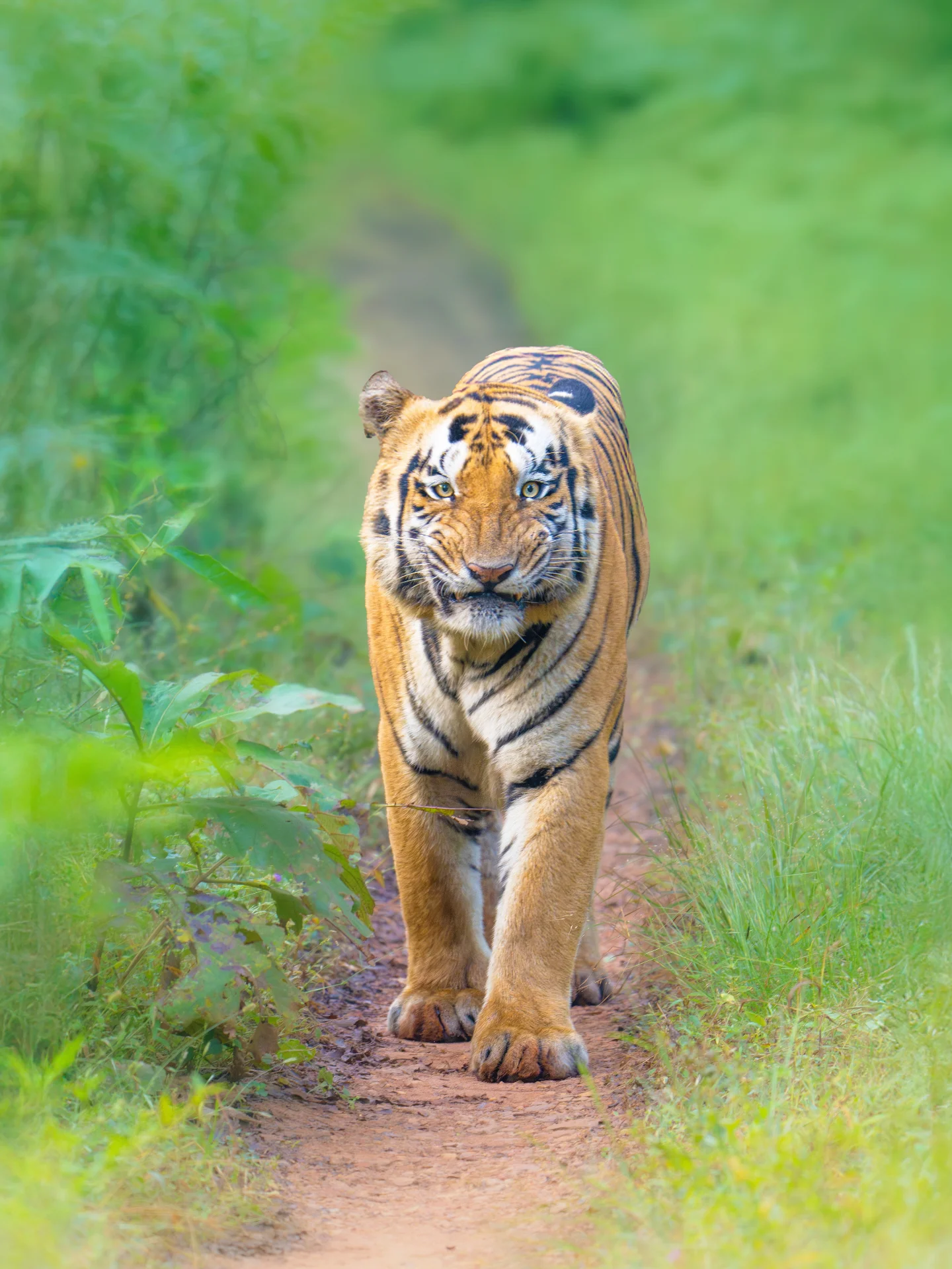The forest canopy includes towering teak trees, dense bamboo thickets, flowering plants, medicinal herbs, and a variety of grasses. Key species include Teak (Tectona grandis), Bamboo (Dendrocalamus strictus), Ain, Mahua, Bija, Tendu, Palas, Semal, and Arjun. Shrubs and climbers such as Lantana, Gum Acacia, Pathari, and Grewia form the understory. Seasonal blooms like karanj flowers, white kachnar, and fiery red Palas blossoms paint the forest in vibrant colors, while monsoons transform Tadoba into a lush green paradise.